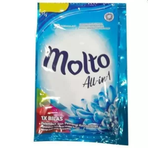 Molto All In One merupakan pelembut dan pewangi sekali bilas yang memberikan wangi tahan lama. Saat ini Molto All In One menggunakan teknologi Ultra Care yang dapat melapisi dan memperkuat pakaian hingga serat kain terdalam, melindungi pakaian dari warna pudar dan kerusakan bentuk pakaian. Menjaganya tetap cantik bahkan setelah dicuci berulang kali. Tidak hanya itu saja, Molto All In One juga terdapat keunggulan lainnya seperti Mengurangi kusut pada pakaian, Mengurangi munculnya serabut dan Wangi tahan lama hingga 14 hari. Selain itu, menggunakan pelembut dan pewangi pakaian Molto saat mencuci pakaian akan menjaga pakaian tetap indah setiap kali dicuci. Seperti pelembut dan pewangi pakaian Molto lainnya, rangkaian Molto All In One membantu menjaga pakaian Anda agar tetap cerah tampak baru lebih lama. Molto All In One hanya dengan satu tetes saja, mampu menambah kesegaran yang tahan sepanjang hari, sehingga lebih hemat.
